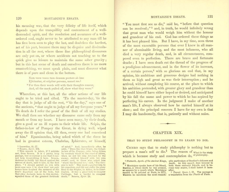 The advantage of this conception of rational life planning is that it is not heroic in its assumptions about the scope of planning and anticipation. It is a scheme that makes sense of the situation of the person in the limited circumstances of a particular point in time. It doesn’t require that the individual have a comprehensive grasp of the whole — the many contingencies that will arise, the balancing of goods that need to be adjusted in thought over the whole of the journey, the tradeoffs that are demanded across multiple activities and outcomes, and the specifics of the destination. And yet it permits the person to travel through life by making choices that conform in important ways to the high-level conception that guides him or her. And somehow, it brings to mind the philosophy of life offered by those great philosophers of life, Montaigne and Lucretius.