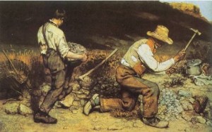 (Courbet’s Stonebreakers is a suitable companion to this topic. Painted in 1849-50, the painting illustrates several aspects of a materialist perspective on the world: an interest in conditions of life and work, an interest in the situation of ordinary working people, and, of course, the depiction of concrete labor — all of these aspects of the painting complement the mentality of Marx’s materialism. T. J. Clark’s brilliant book on Courbet and his social context is well worth reading (Image of the People: Gustave Courbet and the 1848 Revolution).)