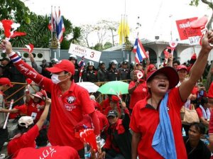The red shirt demonstrations in Bangkok are very interesting. Throughout March 2009 there were massive demonstrations involving tens of thousands of people. They are mostly supporters of the National United Front of Democracy against Dictatorship (UDD; also designated as DAAD), the mass party of former prime minister Thaksin. And generically they are in opposition to the current government and to the yellow shirt movement that brought it to power in street demonstrations in fall 2008. (These demonstrations succeeded in forcing the closure of Bangkok’s airports, which was significant because it threatened the tourist economy upon which Thailand depends.)