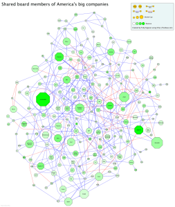 But to get more specific — and to make more precise comparisons over time — it seems that we need some way of identifying and quantifying the idea of a sociologically real “power elite.” One way of trying to do that is by making use of the tools of social network analysis. For example, here is a network graph of corporate America compiled by kiwitobes. What the graph demonstrates is that the boards of America’s largest corporations are populated with directors who overlap substantially across companies; there is a high degree of interconnectedness across the boards of directors of major corporations. So this bears out part of Mills’s thesis in today’s corporate social reality.