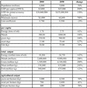 This isn’t a rigorously developed model; it simply makes some basic assumptions about current and future consumption levels for the world’s population and then aggregates them for the full population. It is generally recognized, for example, that there is something like a “nutrition transition” that occurs as income rises for poor people, as they have the ability to substitute more meat and fish for grains and vegetables in their diet. But this implies a disproportionate increase in the amount of farmland dedicated to livestock. And globally, this implies a reduction in forests and grasslands — processes already underway in Central and South America — which has major consequences for CO2 increases and species extinction. Likewise, this impressionistic projection implies a tripling of the consumption of metals and grain; more than tripling of meat consumption; and 2.4 times the level of energy consumption. So it seems that poverty alleviation all but guarantees that the demand for environment-stressing commodities will increase significantly more rapidly than population increase.