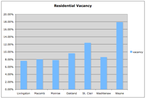 Finally, it appears that the foreclosure crisis had differential impact across the region as well. Wayne County shows the highest residential vacancy rate in 2008 (17.9%), whereas Livingston, Macomb, Monroe, and Washtenaw Counties fall between 7.6% and 8.6%. So the residential vacancy rate in Wayne County is at least double that of other parts of the region.