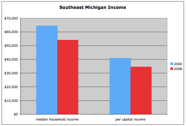 The Southeast Michigan Council of Governments (SEMCOG) has released a preliminary analysis of the data collected in the 2008 American Community Survey (a periodic resurvey conducted by the US Census Bureau; link). Some of the results are startling. Most dramatic is what has happened to income, but the region also shows important changes in residential occupancy, poverty rates, and unemployment.