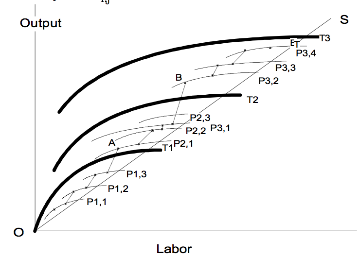 A fourth possibility is even more dramatic. The fundamental technologies in use may be qualitatively improved: manure may be replaced by bean curd, which in turn may be replaced by chemical fertilizers; seed varieties may be significantly improved through selective breeding; electric-powered pumps may improve the availability of irrigation; small tractors may replace oxen and many person-hours of labor. This kind of improvement in productivity can be represented as a jump from one of the heavy curves above to a higher “production possibility frontier.” And this enhancement of agricultural productivity can result in massive increases in the quantity of grain relative to the farming population — thereby permitting a significant improvement in the standard of living for the farming population. This can be referred to as modern technological productivity growth.