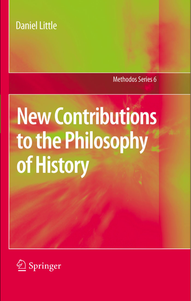 I am pleased at the publication this month of a book I’ve been working on for quite a long time, New Contributions to the Philosophy of History (Methodos Series).  (Here is a link to a digital version of the book on the Springer website.)  The title is self-explanatory. The book is intended to jump-start a new round of conversations within analytic philosophy about the nature of history and historical explanation.  The philosophy of social science and the philosophy of biology have contributed enormously to the progress of research in both these areas, and I believe that new discussions in the philosophy of history can be equally valuable.