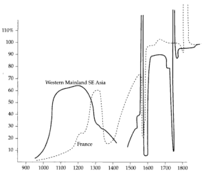 This thought experiment is possible because Lieberman’s argument lends itself to a quantitative interpretation. Essentially he is focusing on factors that can be estimated over time: degree of scope of a regime, degree of integration of institutions, economic productivity, agricultural intensity, rainfall, temperature, population level and density, mortality by disease, and transport capacity, for example. And he is looking for one or more factors whose temporal variations can be interpreted as a causal factor explaining correlations across the graphs. So we could imagine a master graph representing the factual core of the research, with six groups of graphs over time, representing the chief variables for each region over time. Here is Lieberman’s initial effort along these lines, graphing his estimate of “scope and consolidation” of the states of SE Asia and France. And we can imagine presenting different data series representing his findings about agricultural productivity, mortality, population, climate change, etc., arranged around a single timeline.