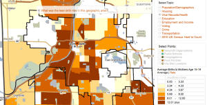 Fortunately, there are good examples of exactly this kind of effort underway in various regions around the country. One such effort is underway at the Community Research Institute, part of the Johnson Center for Philanthropy at Grand Valley State University in Michigan (link). The Institute focuses primarily on several counties surrounding Grand Rapids, but it is also preparing to expand its coverage to other parts of Michigan. With a foundational database linking US Census data geographically, the Institute attempts to provide geographically linked data down to the neighborhood level. Here is an example of a map of the teen birth rate in neighborhoods of Grand Rapids (link). The Center has developed a general tool, MAPAS, that can serve as a platform for integrating and presenting a wide range of social data sources (link).