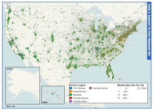 The maps of Tea Party membership are genuinely interesting. Here is an aggregate map including six factions of Tea Party organizations around the country (p. 14):