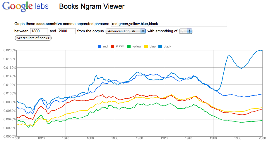 Here is another aspect of the graph that is also suggestive of artifact: the long wave of rise and fall in the frequency of all the color words between 1810 and 1920. It is not impossible that “color” became more important in literary language and then declined; but that seems improbable. So this long wave coordinated behavior of the color words seems to be more likely the effect of a database anomaly than a manifestation of a real trend.