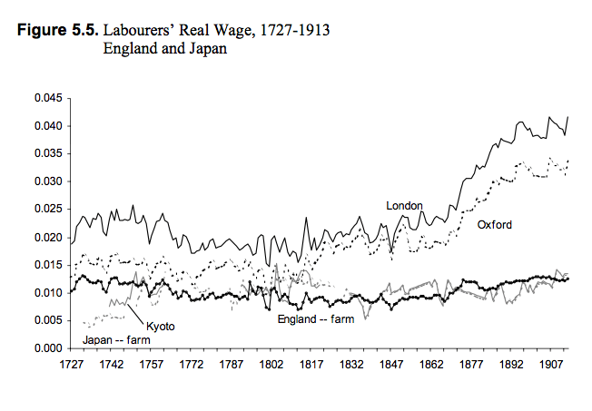 The graph indicates a significant premium for laborers’ wages in London, whereas Japanese and English farm wages are fairly similar throughout most of the period. And it indicates a “take-off” for London laborers’ wage beginning in the mid-nineteenth century — not paralleled by a similar take-off in Kyoto.