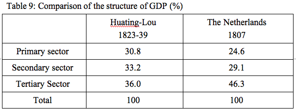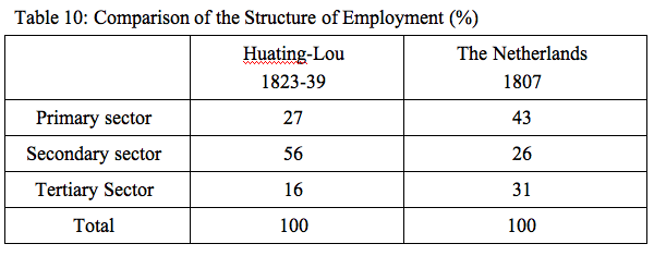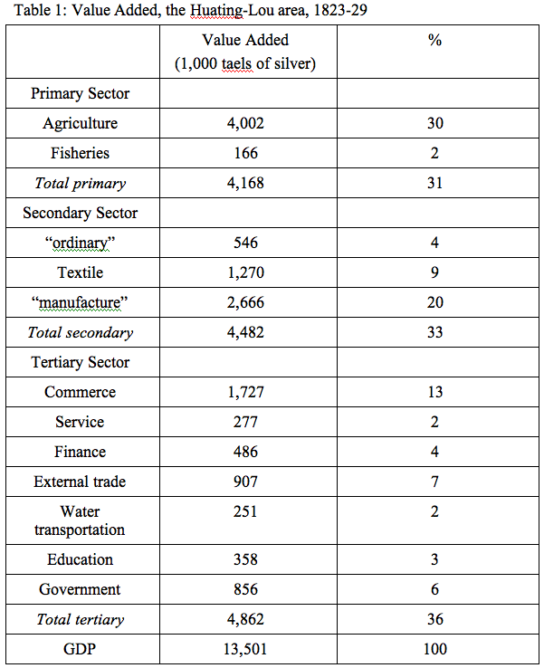 Second, the sectoral composition of the Huating-Lou economy is genuinely surprising (as indicated in table 1). We commonly think of China’s Ming-Qing economy as largely rural and agricultural. But the primary sector, including agriculture and fisheries, amounts to only 31% of the local economy, while the secondary sector (manufactures and textiles) contribute 33% and the tertiary sector (commerce, service, government, etc.) contributes 36%. The prior expectation we might have had of the early modern Chinese economy as largely agricultural is flatly refuted for this region by the 1820s. This finding is corroborated by Li’s analysis of the structure of employment in the region; only 27% of employment was in the primary sector, with 56% in the secondary and 16% in the tertiary sectors.