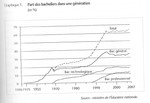 And what about education? Maurin draws attention to the progress of the bac over the past 60 years. The creation of the bac technologique and the bac professionnel in 1968 and 1988 respectively conjoined with growth in the bac general to produce rapid increase from the mid 1980s through 1990s; and the total has remained flat since the 1990s.