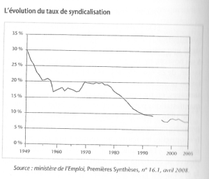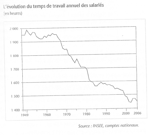 Here are several graphs representing economic and social changes in the past thirty years. The first tracks the percentage of adults in different socio-economic groups: workers, managers, professionals, executives, farmers, and permanently unemployed. The second tracks the fairly steep decline in the number of hours worked annually by a worker, from under 2000 to under 1500. The third tracks the shifting composition of the workforce, documenting a dramatic decline in industrial labor from 35% to 15%. And the fourth graph tracks union membership, from a high of 30% in 1949 to a low of 8% in 2005. This is surprising for Americans who think of the French workforce as being highly unionized.