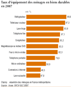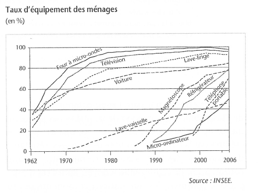 Here is an indication of how French consumption has evolved over the past sixty years. Television and washing machines started early; home computers and mobile phones came in the decade of 1990-2000. (It appears that several labels may be switched on this graph; it’s hard to believe that microwave ovens became common well before refrigerators. And in fact the 2007 snapshot from INSEE suggests that these two labels have been switched.)