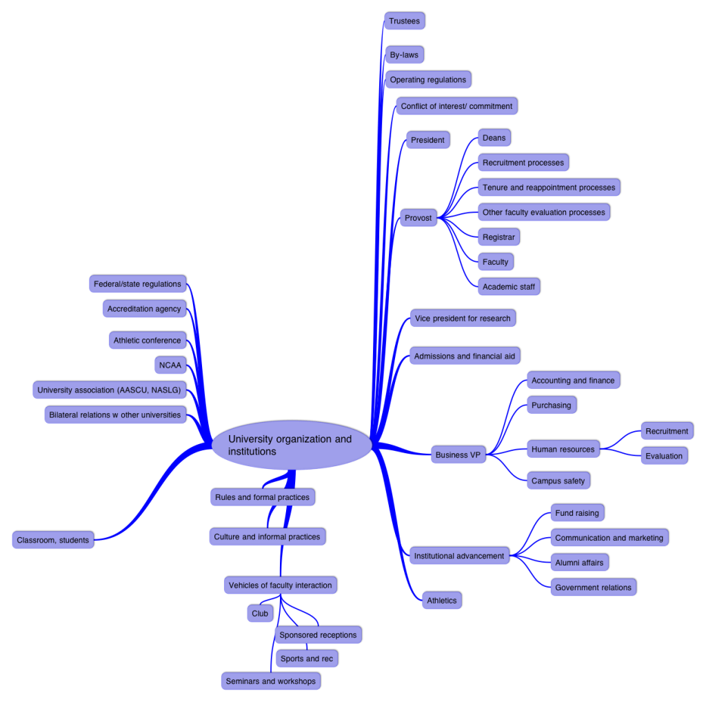 But how do we go beyond these general statements about structural causation? It may be helpful to think through a familiar example — the ways in which a specific institution like a university both shapes and influences the behavior of many individuals, and the ways in which its own internal functions and culture are themselves constituted by the behaviors, beliefs, attitudes, and morés of the individuals who fall within its ambit. Here is a sketch of the functional organization of a fictitious university:
