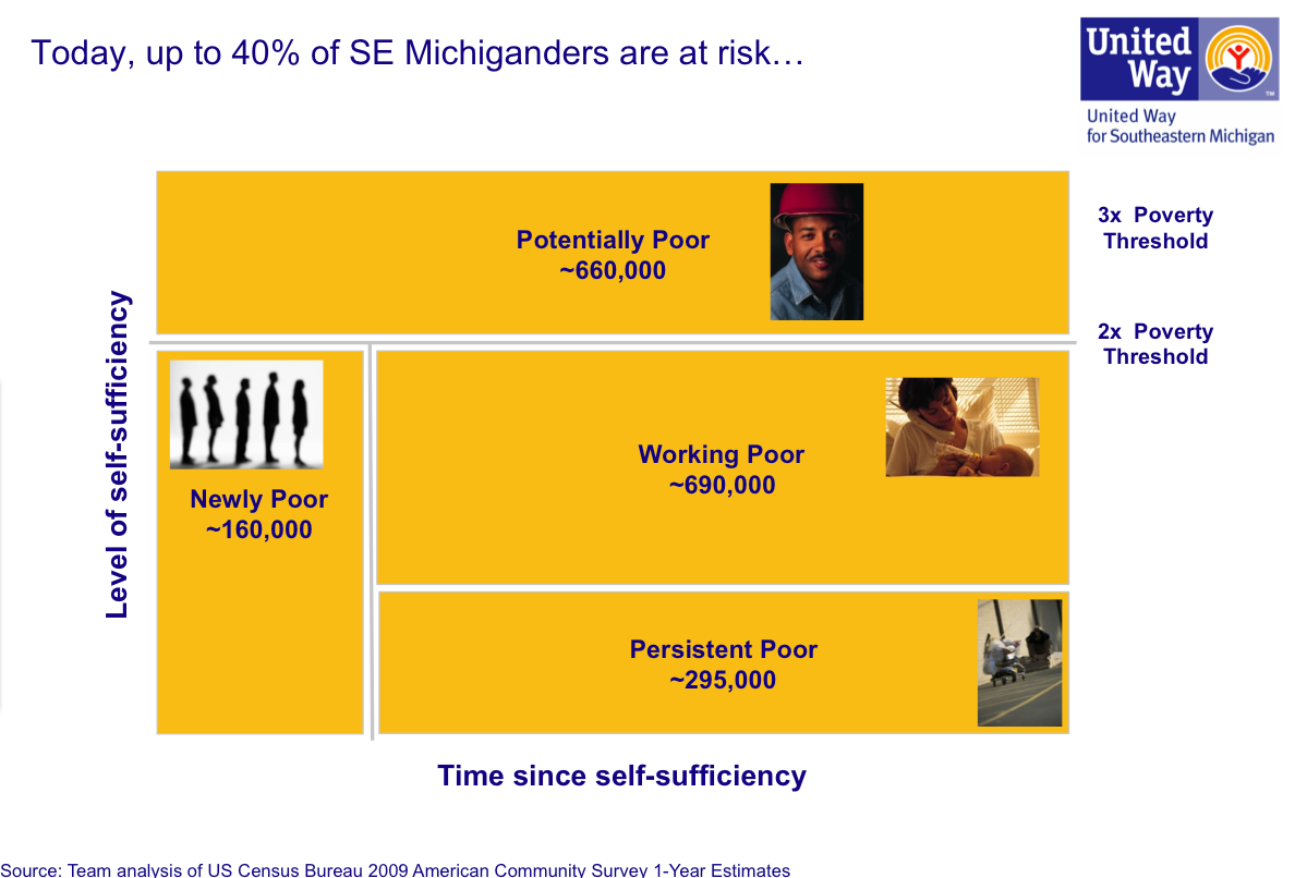 This is a truly sobering statistic: two out of five residents of Michigan fall within the groups of the persistent poor, working poor, newly poor, and potentially poor.