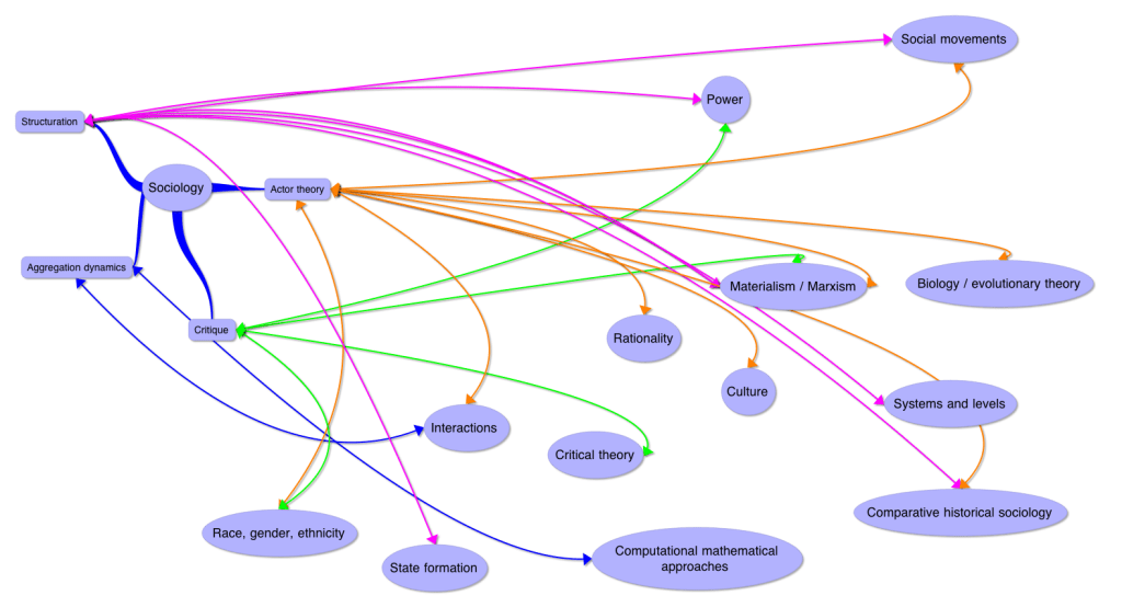 The upper left quarter of the diagram represents sociology as a compound of four large meta-topics: structuration, actor theory, aggregation dynamics, and critique. The links in many colors bring this formation into relationship with a large number of topics and approaches within sociology, indicating roughly where topics such as “state formation” or “social power” fit within the framing topics. It would seem possible to work iteratively with a graph along these lines along with a careful reading of the three handbooks mentioned here, and fill out a set of meta-topics that would capture the great majority of the approaches described in the handbooks. Further, it might be illuminating to begin to map the links that exist between first-order topics in the graph — for example, between “social movements,” “materialism,” and “culture.”