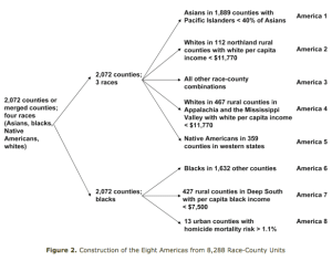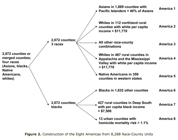 The authors analyze mortality statistics by county, and they break the data down by incorporating racial and demographic characteristics. The data groups fairly well around the eight Americas mentioned in the title: