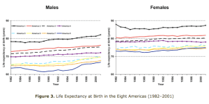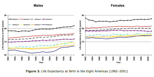Here is a time-series graph of the behavior of longevity for the eight Americas: