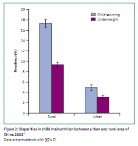 In figure 1 the data demonstrate a strong correlation between life expectancy and average income for China’s provinces and municipalities, from just about 65 years for the poorest regions to 78 years in Shanghai region. Figure 2 demonstrates major inequalities in child health between rural and urban locations. The authors further report that infant mortality also varies dramatically across regions: “Rural infant mortality rates are nearly five times higher in the poorest rural counties than in the wealthiest countries — 123 versus 26 per 1000 live births, respectively” (26). One important source of data on these issues that these researchers use is the Chinese National Health Service survey of 1998; link.