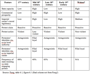 Hung provides an interesting tabulation of several important characteristics of protests in mid-Qing China that I’ve reproduced below. I’ve supplemented the table in two ways. First, I’ve included in this table the data Hung reports on the incidence of state-resisting protests, which vary significantly throughout the period he studies (figure 6.1). Second, I’ve added an additional column of my own indicating how Wukan seems to measure up on these criteria. The finding that I’ve come to is that Wukan began as a “filial protest” through which villagers sought to engage the state to obtain relief from local officials. The protest has been pushed into a more “state-resisting” posture, however, as a result of the violence and intransigence of local and county officials, and the fact that Beijing has so far ignored the villagers’ demands.