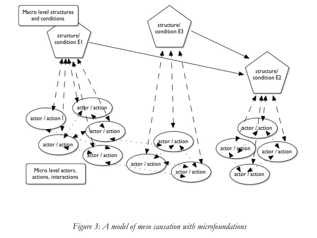 The key is the role that we expect reasoning about micro-level events to play in the explanation itself. The various versions of methodological individualism — microeconomics, analytical sociology, Elster’s theories of explanation, and the model of Coleman’s boat — presume that explanation needs to invoke the story of the micro level events as part of the explanation. The microfoundations-meso explanation perspective requires that we be confident that these micro-level events exist and work to compose the meso level; but it does not require that the causal argument incorporates a reconstruction of the pathway through the individual level in order to have a satisfactory explanation.
