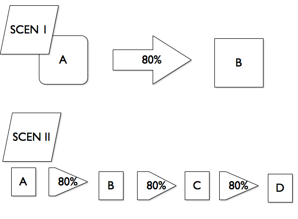 I addressed one aspect of this question in an earlier post, where I considered whether causal mechanisms can be complex and multi-staged. There I focused on the idea that most theories of causal mechanisms require that there be a reasonably strong regularity between input and output. This implies that a multi-step causal process will probably not qualify as a mechanism, because the intervening causal steps will imply a low association between initial condition and output condition. (See the post for more details.) And this in turn implies that a social mechanism needs to consist of one step: the instigating condition occurs and then the output condition occurs. The diagram illustrates the point. Scenario I represents a single-step causal mechanism; scenario II represents a three-step causal process composed of three component mechanisms. Scenario II does not qualify as a mechanism itself, because the compound probability of D given A is only 50%.