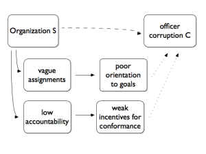 The dashed line indicates the causal power. The solid arc lines on the left indicate “composition”. The solid arrows indicate meso-meso causal mechanisms. And the dotted lines indicate the aggregate consequences of “poor orientation to goals” and “weak incentives for conformance”, which is an elevated level of officer corruption. So the meso-level power depends on sub-meso level mechanisms and actor-level mechanisms.