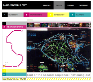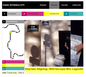 With her eyes Mrs. Lagoutte looks at the name “rue la Vieuville” in white letters on a blue background. With her forefinger she points at the same name “rue la Vieuville” in bold type on the map she’s holding with her other hand. With a quick movement of the chin she accommodates her gaze to these two very different texts: one, written diagonally on the page, is 1mm big and requires short-sightedness; the other, horizontal, is 6cm high and requires long-sightedness. A miracle! The two match, letter for letter, despite the glaring differences. She’s arrived! This is the street she was looking for… and here’s number five! In a single glance at her map she embraces the entire eighteenth arrondissement. By lifting her head she sees only a white wall, very much like all the others, that she couldn’t have identified without having been born in the neighbourhood or living there for a long time. Fortunately she also sees the street nameplate and the name written on it. What does she see? What is she touching with her forefinger? The reader navigates the presentation by choosing “Traversing,” “Proportioning,” “Distributing,” and “Allowing” on the top bar, and then navigating from Plan to Plan in the sidebar. It is possible, of course, to go through the presentation in a fully linear mode; but it is also possible to jump easily from “Traversing” to “Distributing” or from Plan to Plan.
