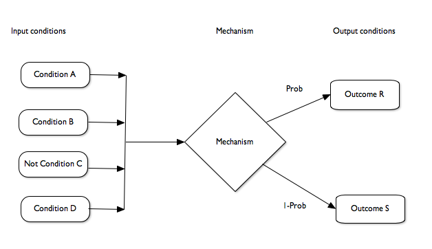 In this diagram A, B, and D are jointly sufficient for the working of the mechanism, and C is a “blocking condition” for the mechanism. When A,B,C,D are configured as represented the mechanism then does its work, leading with probability PROB to R and the rest of the time to S.