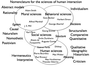 So what is involved in the concept of the human sciences? Most centrally, the idea was that there was a fundamental difference between the sciences of nature and the sciences of human action and interaction, because the former had to so with causation whereas the latter had to do with the interpretation of meaning. The human sciences were thought to be interpretive or hermeneutic at their core. A key task for the systematic study of human affairs was to make sense of the actions and expressions of the people involved. We understand a social fact when we understand the intentions, meanings, and self-understandings of the people involved. The tradition of the “human sciences” brings along with it the ideas of hermeneutics, verstehen, and critical theory.