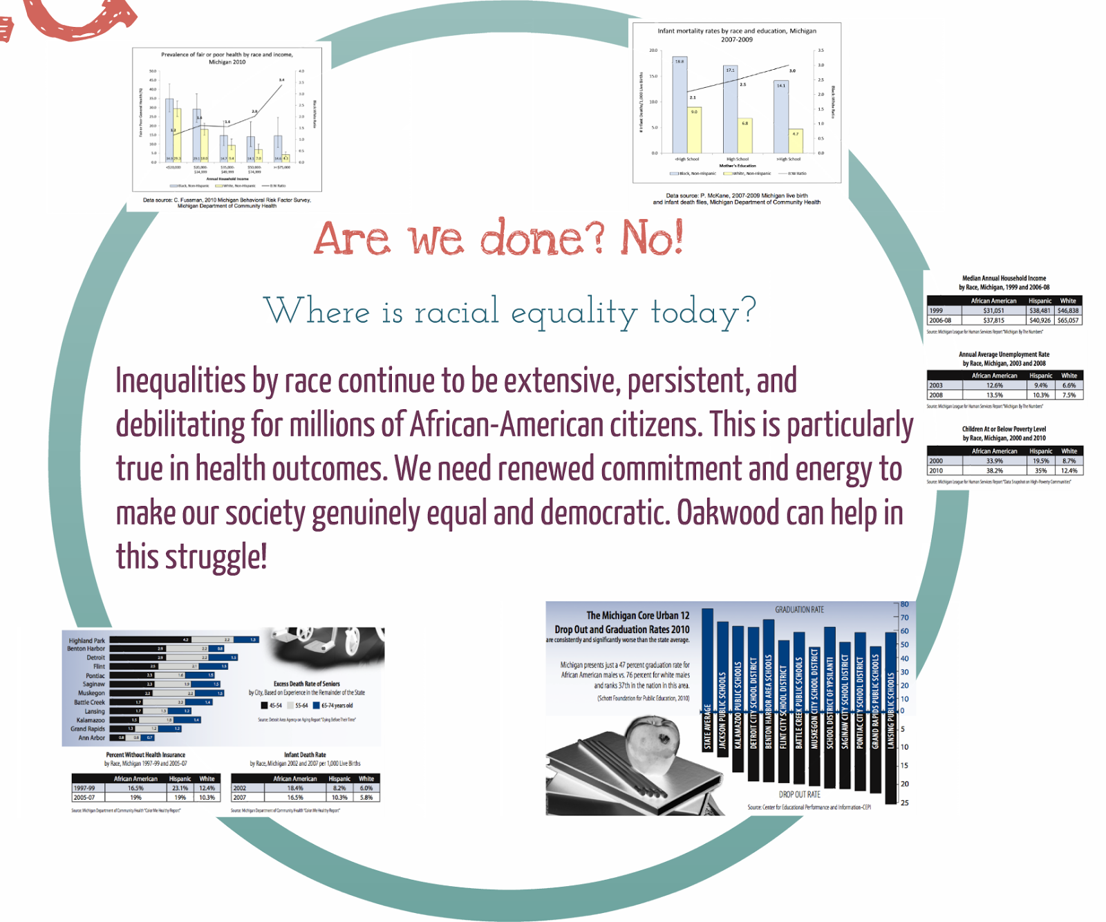 One of the most troubling and persistent disparities along racial lines is in the area of health status, including disease rates, infant mortality, and longevity. Black individuals have higher rates of disease and morbidity than their white counterparts. And these differences across racial groups persist even when we control for income, so they are not simply a secondary effect of poverty. There has been a great deal of research in schools of public health as to why this is so. Some factors are obvious — differential rates of health insurance, different levels of access to hospitals and clinics, and different levels of quality of neighborhood healthcare resources. But given that even affluent segments of the black community have higher rates of various diseases than their white counterparts, there must be more to the story. One possibility is that there are differential patterns of treatment by health providers across racial groups. Do black women receive mammograms at the same rates as white women? Not everywhere. Another possible mechanism is the factor of stress as a determinant of health. Some public health scholars have explored the possibility that daily lives for black people within a highly racialized society incorporate a background level of personal stress that impairs health (link).