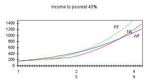 The neo-liberal strategy consistently maximizes GDP; but the poverty-first strategy, which is more redistributive from the start, leads to consistently better improvement for the income for the bottom 40% of the economy. It embodies the idea that Hollis Chenery advocated forty years ago in Redistribution with Growth: Policies to Improve Income Distribution in Developing Countries in the Context of Economic Growth.