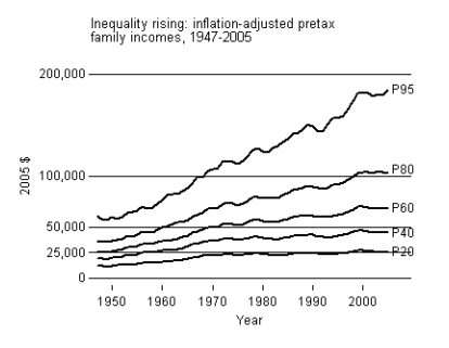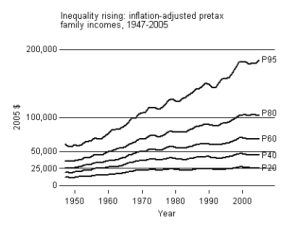 This all has to do with the dynamics of income at the bottom end. But we have also seen persistent widening of income at the top end. American capitalism has produced ever-widening inequalities of income for at least the past forty years. Consider these two graphs of income by percentile provided by Lane Kenworthy: