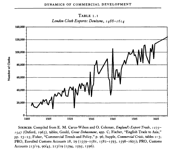 To offer a historical analysis of commerce, it is necessary to have extensive commercial data. Appropriately, Brenner’s research depends heavily on good information about imports and exports throughout the period. Here is his compilation of London cloth exports 1488-1614: