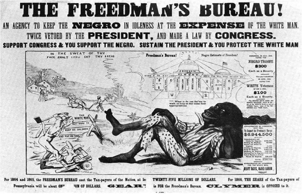 White conservatives saw their fears confirmed during Reconstruction. This cartoon reveals their view of the Freedmanās Bureau, described as āan agency to keep the Negro in idleness at the expense of the white man: