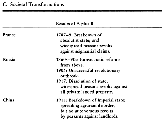 The summary tables above both mirror the definition Skocpol has crafted and reveal the essence of her comparative causal analysis of the three primary cases. Tables 1A and 1B provide a coding of the states of affairs in France, Russia, and China in what she identifies as the relevant initial structural conditions — conditions relevant to political crisis and peasant uprisings. Table 1C represents her view of the proximate outcomes of these conjunctions in the three cases — breakdown of effective state power and emergence of widespread rural unrest. And Table 2 reflects her effort to code the more distant outcomes in the three cases, when the dust had settled — the nature of the political configurations and state systems that emerged from the revolutions that took place.