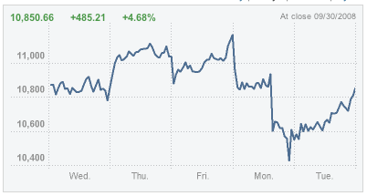 It is evident that this expectation of gradual, continuous change is not always a valid guide to events. Abrupt, unexpected events occur — revolutions, mass cultural changes like the 1960s, sweeping political and legislative changes along the lines of the Reagan revolution. And of course we have the current example of abrupt declines in financial markets — see the graph of the Dow Jones Industrial Average for the week of September 23-30, 2008 below. So the expectation of continuity sometimes leads us astray. But continuity is probably among our most basic heuristic assumptions about the future when it comes to our expectations about the social world and our plans for the future.