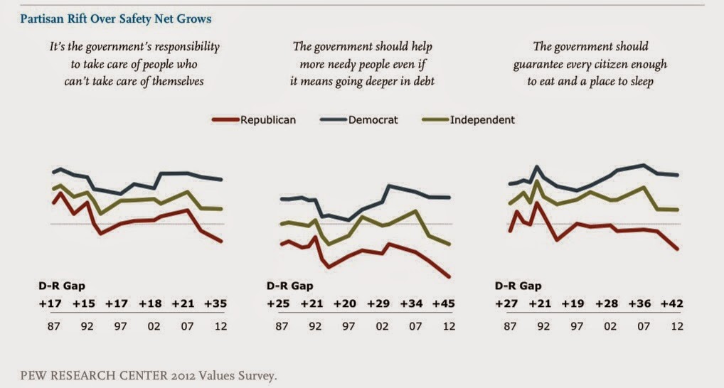 So how have American public attitudes about the key elements of the social safety net changed in the past fifteen years? Support has both polarized and declined. Here is a graph from the Pew study: