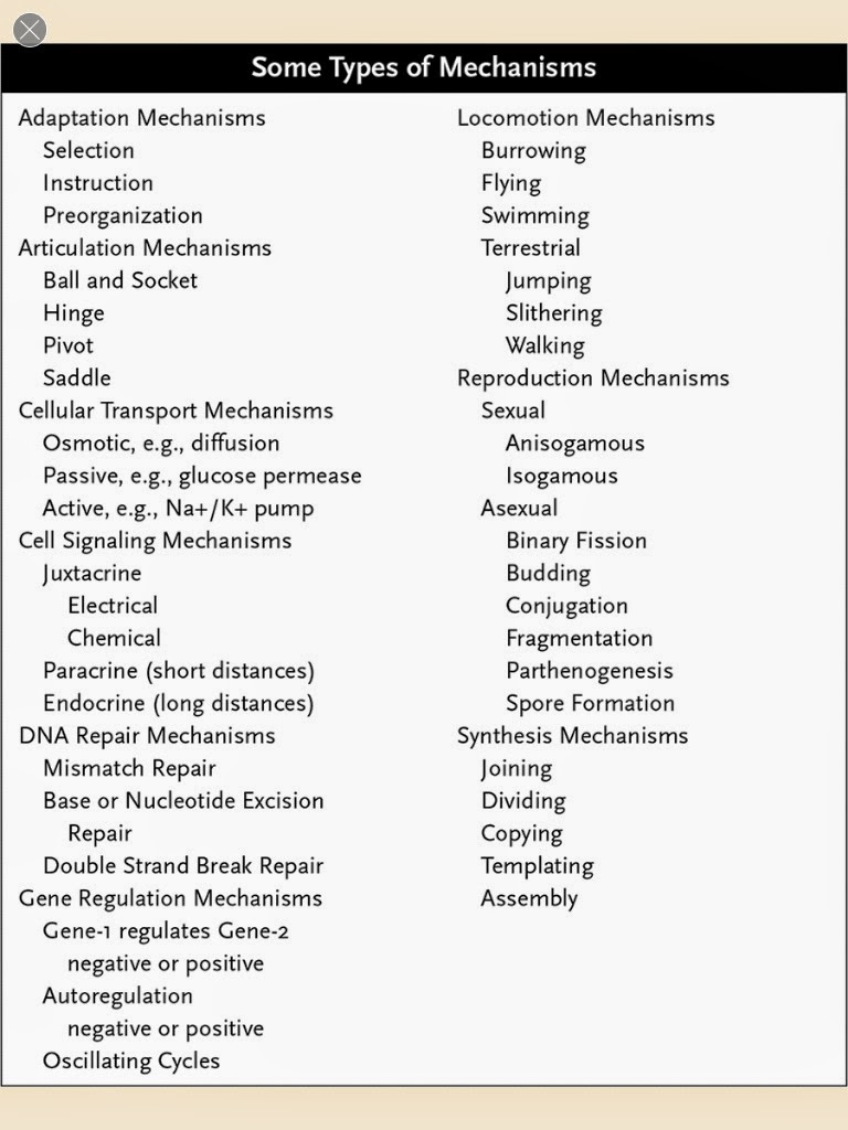 This table is useful exactly because it is not intended to be comprehensive or exhaustive. Rather, it is intended to provide a list of concrete mechanisms that have been observed and investigated in the biological sciences. And, as Craver and Darden argue, a large available base of known mechanisms provides a starting point for researchers who are confronting a novel phenomenon.