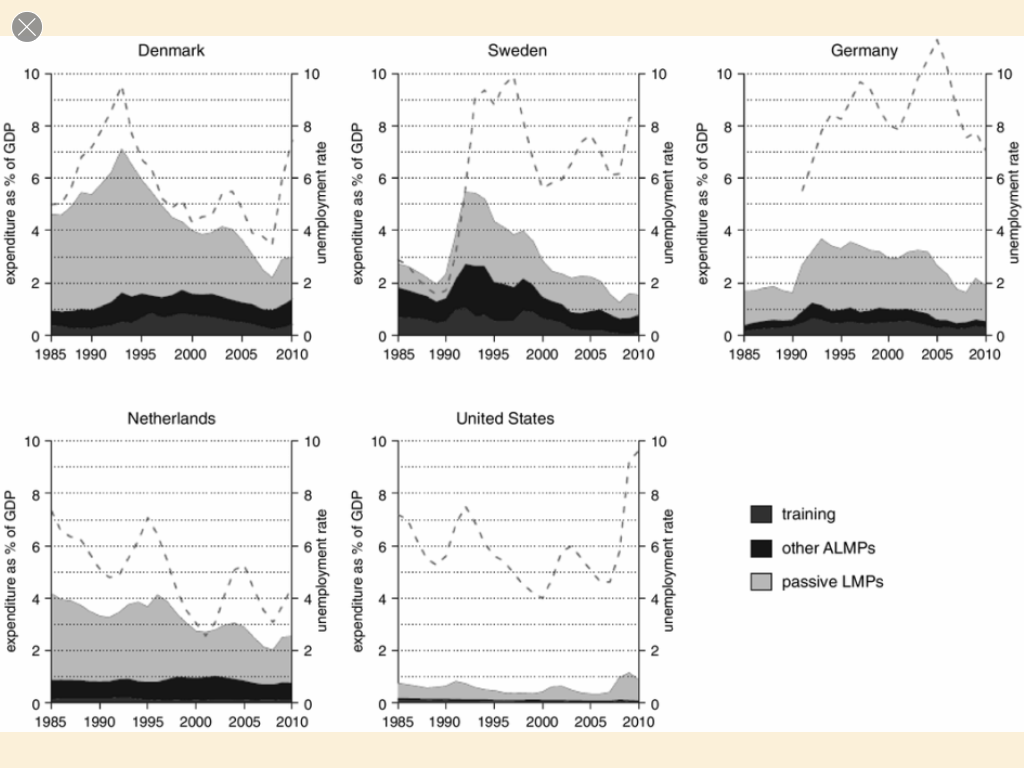 The graphs above demonstrate the current structural differences among Denmark, Sweden, Germany, Netherlands, and USA when it comes to training and income support for the unemployed and underemployed. It is visible that the four European economies devote substantially greater resources to support for the unemployed than the United States. And on the triumphalist view, the states demonstrating more generous benefits for the less-well-off will inevitably converge towards the profile represented by the fifth panel, the United States.