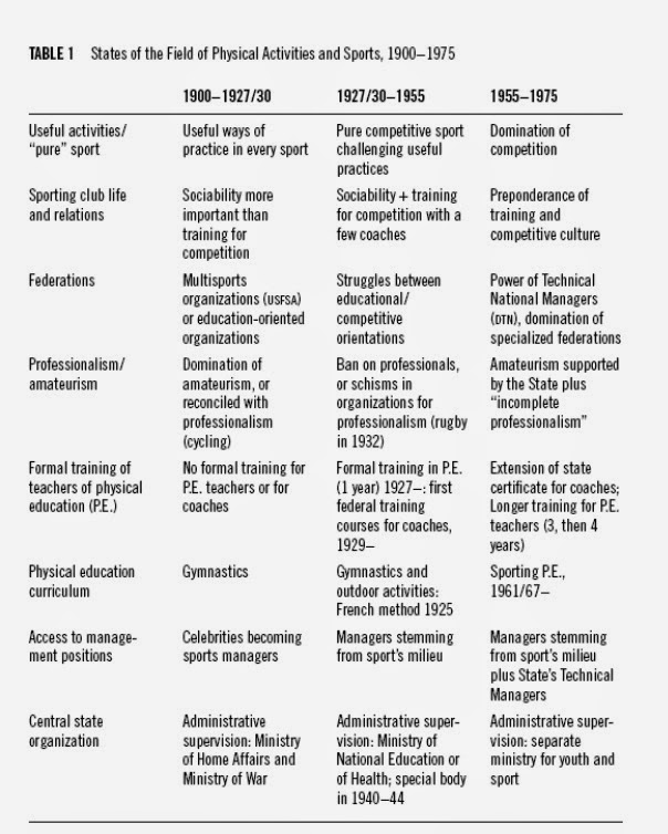 And this is how Defrance structures his own research into the field of French sports. (In what is perhaps a surprising juxtaposition, Defrance also relates his analysis to Nelson Goodman’s Ways of Worldmaking.)