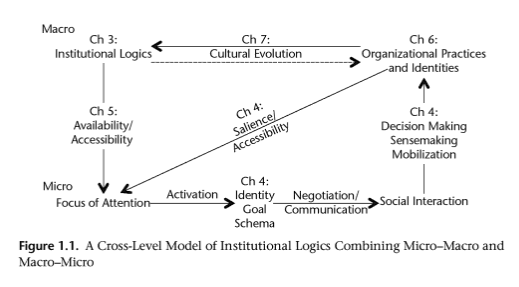 Interestingly enough, here is a rather similar diagram (in structure, anyway) that is provided by Thornton, Ocacio, and Lounsbury in their presentation of the field of “institutional logics” (The Institutional Logics Perspective: A New Approach to Culture, Structure and Process):