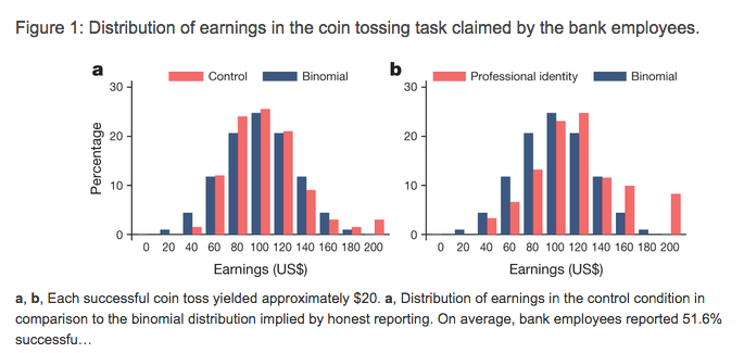 But second, the data seem to refute the “culture and character” interpretation. The same set of experiments supports the finding that when these same individuals approach the coin-tossing task with a mental framework oriented towards everyday personal life, their choices revert to the generally honest behavior of the broader population. In other words, these findings do not support the idea that banking either recruits or creates dishonest people. Rather, the findings seem to imply that banking encourages dishonest behavior within the specific framework of banking business and only while the workplace signals are salient.