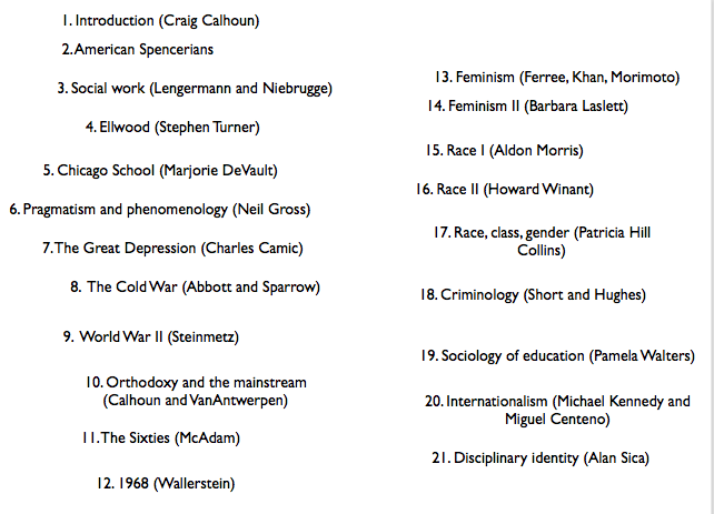 A different approach is that taken by Craig Calhoun and more than twenty collaborators in Sociology in America: A History, with essays on twenty topics and periods within the intellectual geography of American sociology since the mid-nineteenth century. Here is an abbreviated table of contents of Calhoun’s book:
