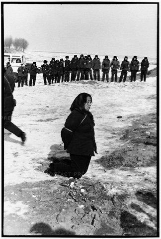 Related to this is the cruelty that the photos depict. There is no pity shown for the victims forced to humiliate themselves, who are physically tormented, and who were sometimes killed. What is portrayed is a merciless public scapegoating of people, often for the most trivial or spurious of reasons. People were accused of belonging to one of the “four elements” — landlords, rich peasants, counter-revolutionaries, or “bad characters” (55), and they were dealt with summarily. Physical violence was common; but so too was a deep and sustained imposition of shaming on the hapless school teacher, local party official, or slightly better-off peasant. Li describes the scene of the execution of seven men and one woman, two of whom were “counter-revolutionaries” because of a flyer they had published titled “Looking North”. The scene of the execution troubled Li for many years. “All eight were put on the backs of trucks in pairs, driven through town, then out to the countryside northwest of Harbin. There, on the barren grounds of the Huang Shan Cemetery, they were lined up, hands tied behind their backs, and forced to kneel. They were all shot in the back of the head” (139). The sequence of photos Li took of this execution are harrowing. The final photos of the volume depict the execution of Wang Shouxin, a former Party branch secretary, on charges of embezzlement, in 1980 (after the end of the Cultural Revolution). Li Zhensheng was present for this killing as well. (The woman kneeling in the photo above is Wang.)