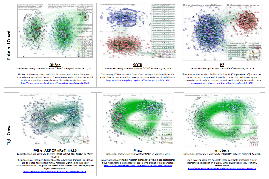 If a topic is political, it is common to see two separate, polarized crowds take shape. They form two distinct discussion groups that mostly do not interact with each other. Frequently these are recognizably liberal or conservative groups. The participants within each separate group commonly mention very different collections of website URLs and use distinct hashtags and words. The split is clearly evident in many highly controversial discussions: people in clusters that we identified as liberal used URLs for mainstream news websites, while groups we identified as conservative used links to conservative news websites and commentary sources. At the center of each group are discussion leaders, the prominent people who are widely replied to or mentioned in the discussion. In polarized discussions, each group links to a different set of influential people or organizations that can be found at the center of each conversation cluster.