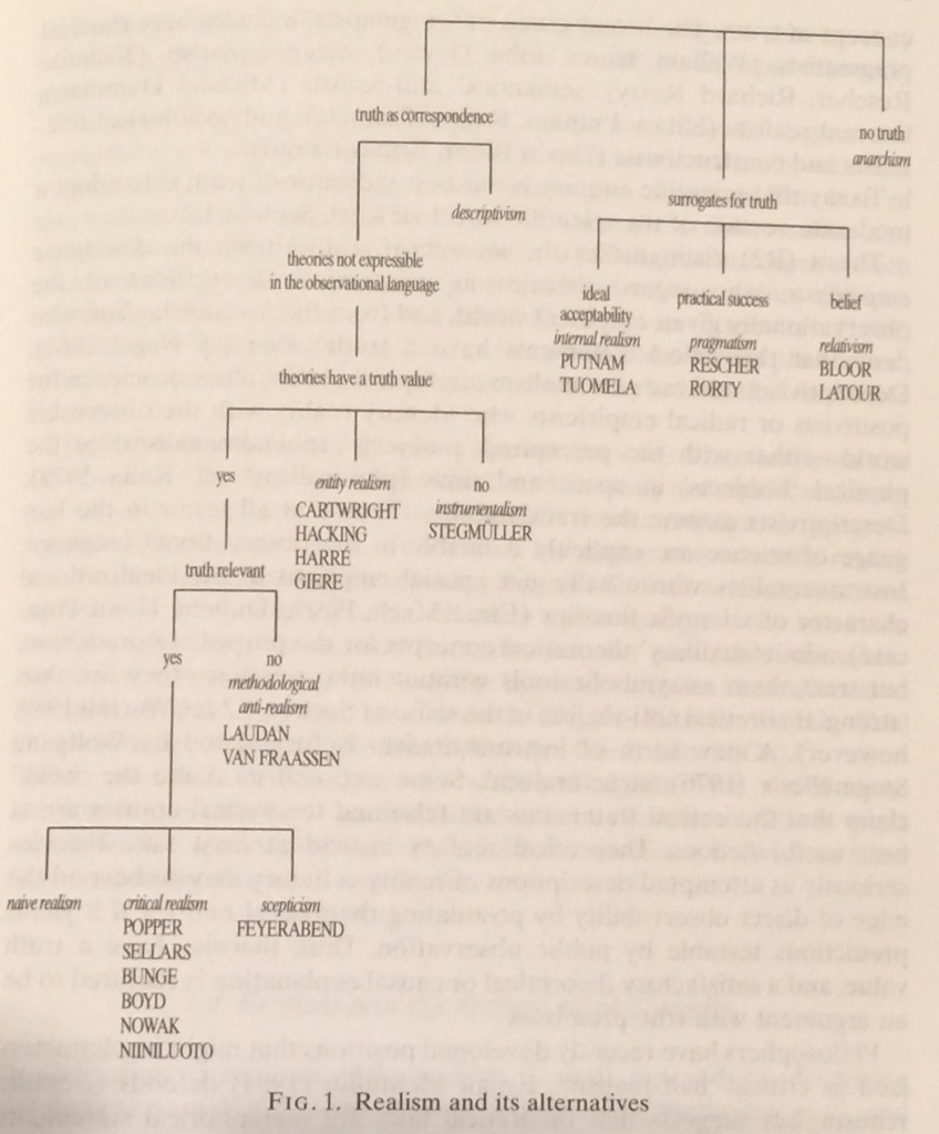 Ilkka Niiniluoto’s 1999 Critical Scientific Realism proceeds from the general orientation of Roy Bhaskar’s critical realism. But it is not a synthesis of the philosophy of critical realism as much as it is an analytical dissection of the logic and plausibility of various claims of scientific realism. As such it is an excellent and rigorous introduction to the topic of scientific realism for current discussions. Niiniluoto analyzes the metatheory of realism into six areas of questions: ontological, semantical, epistemological, axiological, methodological, and ethical (2). And he provides careful and extensive discussions of the issues that arise under each topic. Here is a useful taxonomy that he provides for the many variants of realism (11):