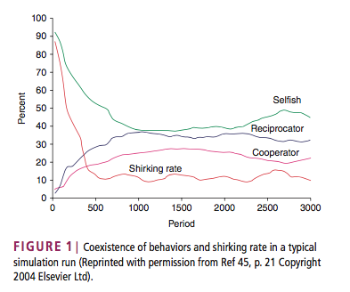 This graph represents the relative frequency of the three types of hunter-gatherers in the population, along with a calculated shirking rate for each period. The Selfish profile remains the most frequent (between 40% and 50%, but Reciprocators and Cooperators reach relatively stable levels of frequency as well (between 30% and 40%, and between 20% and 30%). As Bowles and Gintis argue, it is the robust presence of Reciprocators that keeps the Selfish group in check; the willingness of Reciprocators to punish Selfish actors keeps the latter group from rising to full domination.