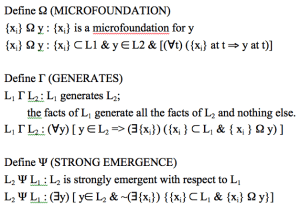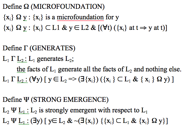 In other words, it appears that each of the concepts of supervenience, reduction, emergence, and generative dependence can be defined in terms of the availability of inavailability of microfoundations for some or all of the facts at a higher level based on facts at the lower level. Strong emergence and generative dependence turn out to be logical contraries (witness the final two definitions above).